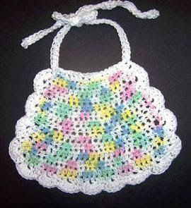 Row 13 ch 1, sk 1 sc, *5 dc in next sc, sk 1 sc, sc in next sc, repeat from * around, end sl st in last sc at top right side of bib, do not crochet across top, do not fasten off.